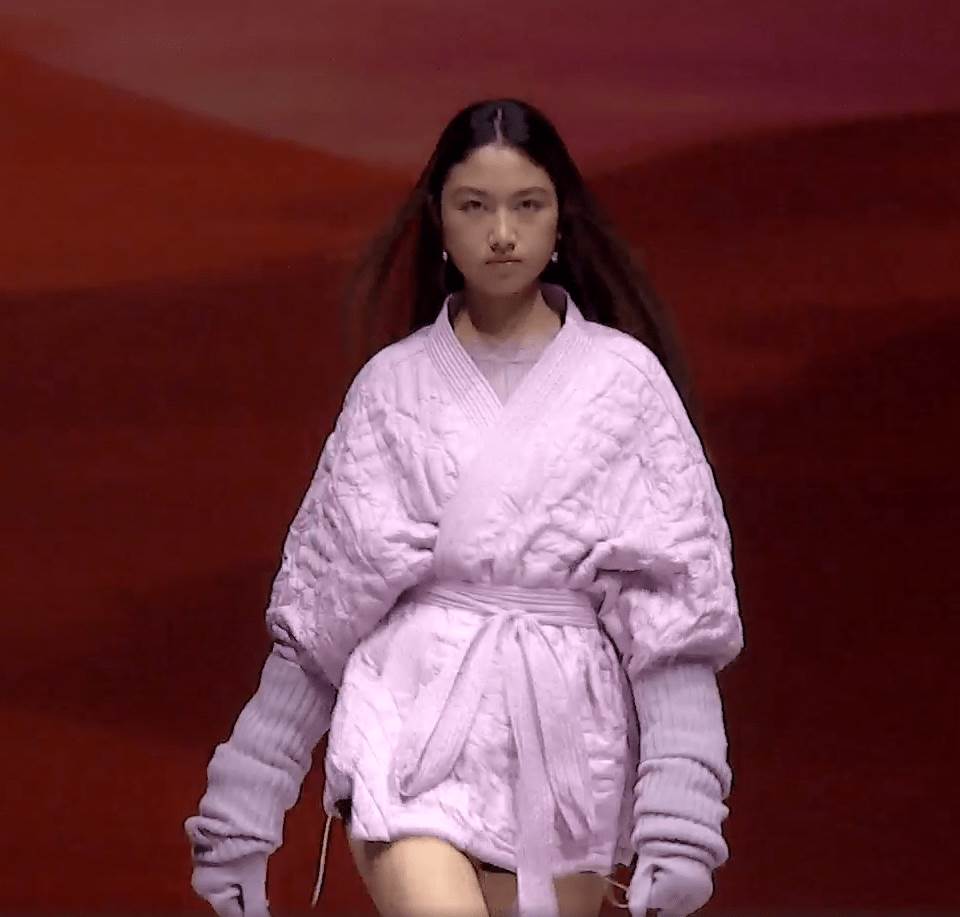 跟大表姐同台走秀的任晴佳絲毫不怯場,雖然只有16歲而且是第一次走T台,但是任晴佳表現得很好,上身穿了一件看起來像浴袍一樣的粉色外套,下身搭配黑色小短褲,配上一頭黑發瀟灑飄逸仿佛走路都帶風,一米八的身高讓任家倩氣場全開,完全不輸超模。